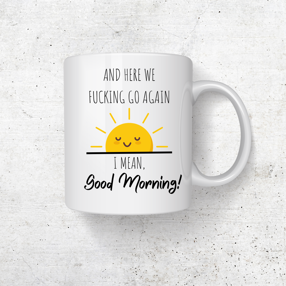 This product, the AND HERE WE F*ING GO AGAIN COFFEE MUG, comes in two sizes and is made of ceramic. It is a great addition to your mornings, providing a bold statement with a little profanity.