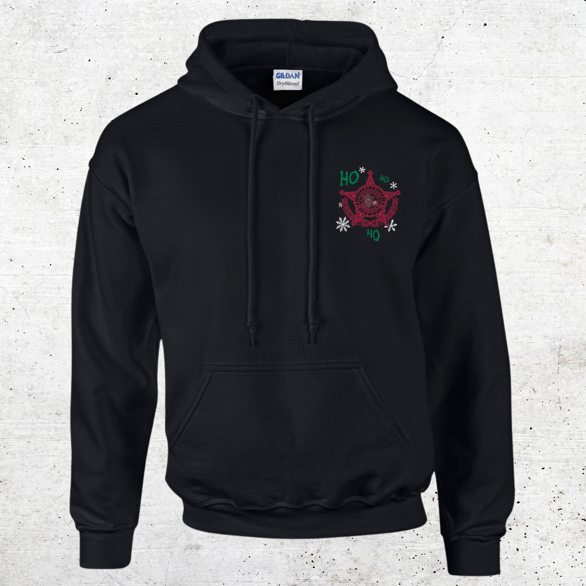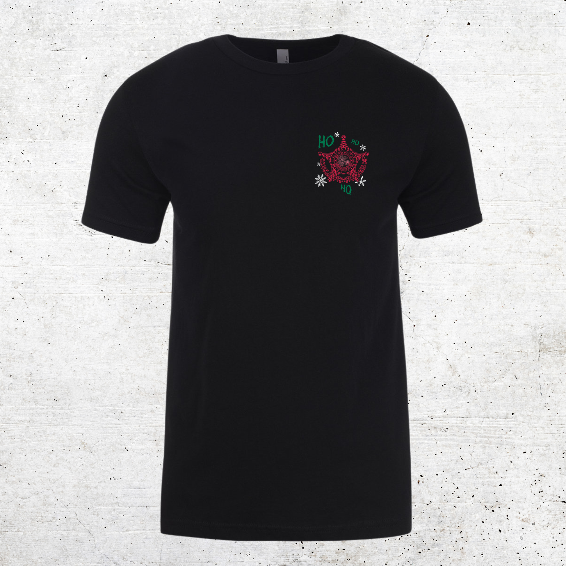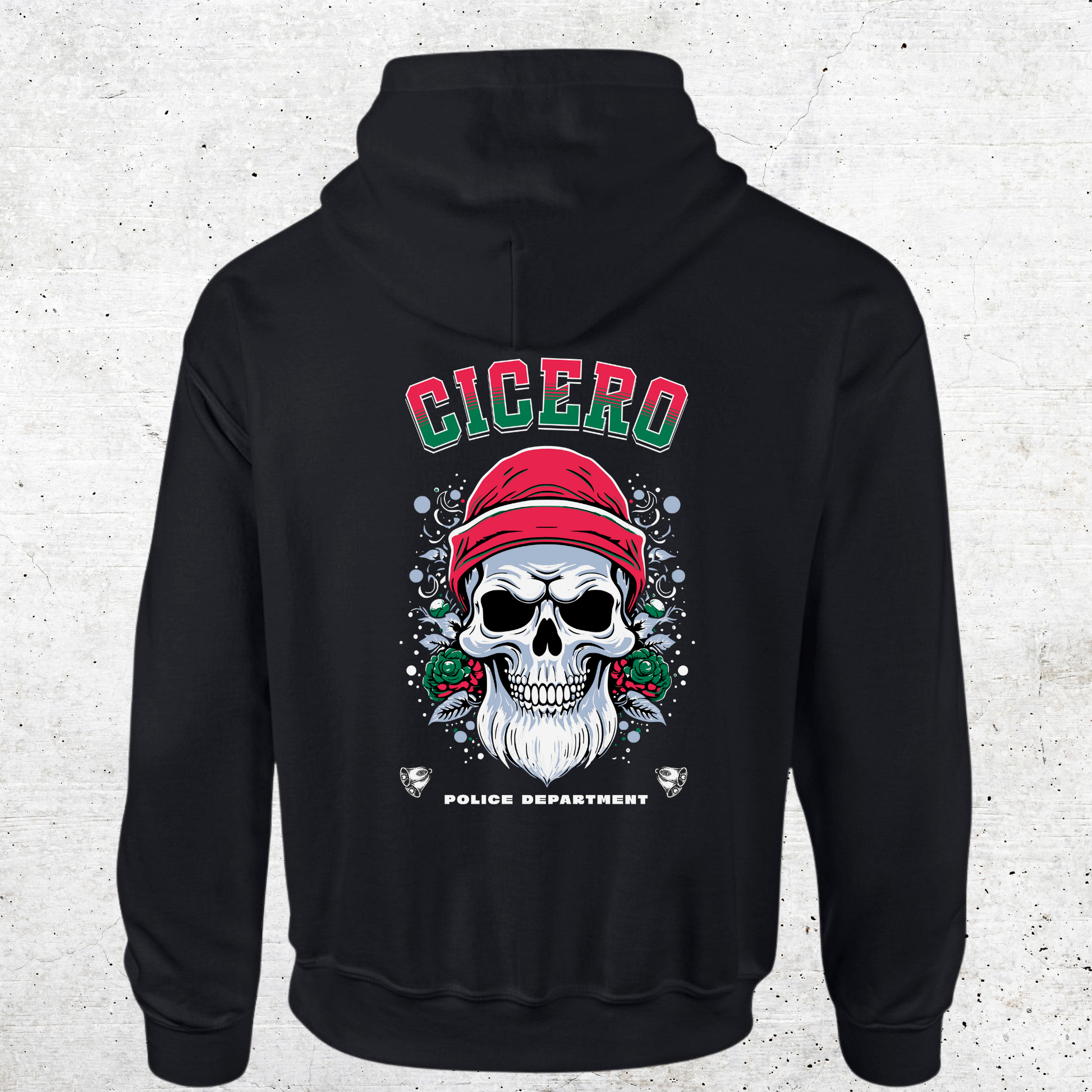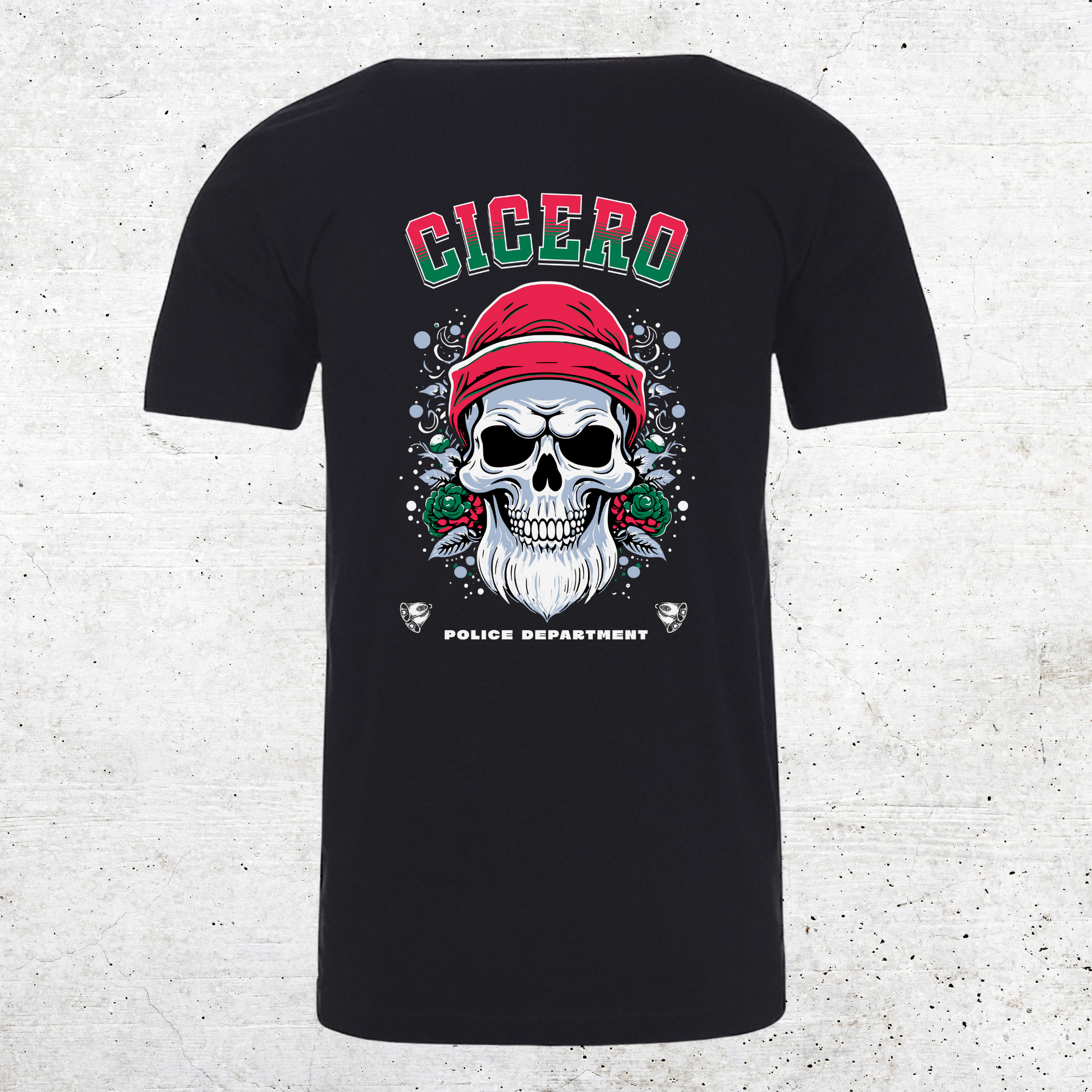 This CICERO PD Christmas t-shirt features the iconic CICERO STAR on the front left chest and a festive Skull Santa design on the back. Show off your holiday spirit and support for your local police department with this unique and stylish shirt. Perfect for wearing at holiday gatherings and events.