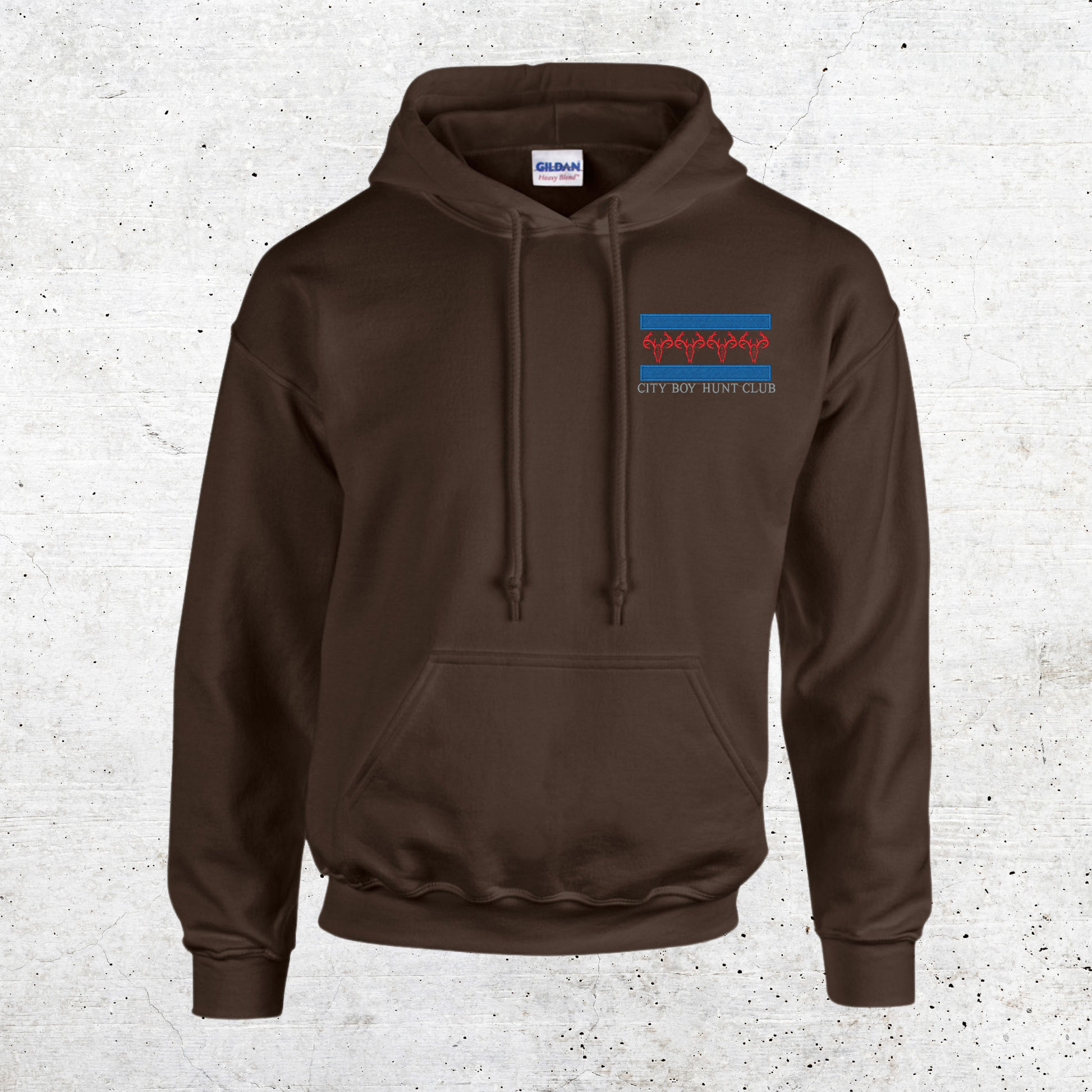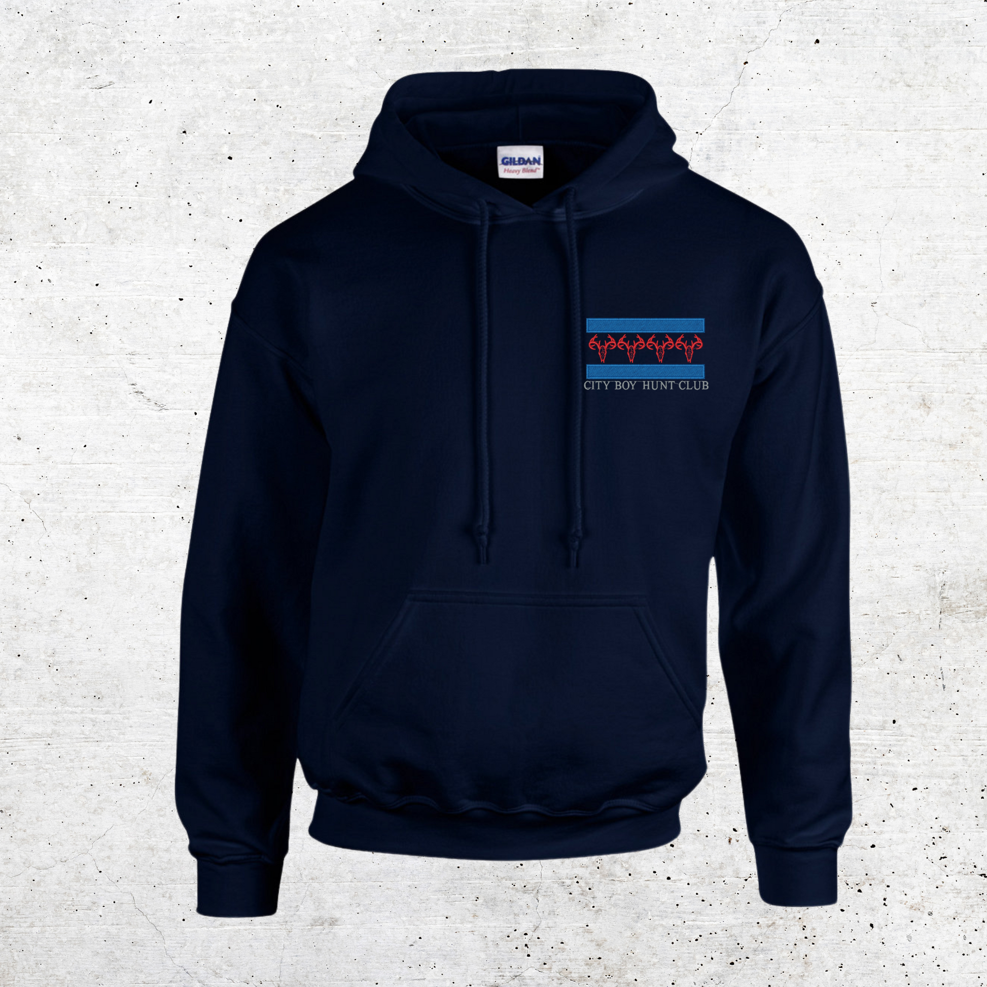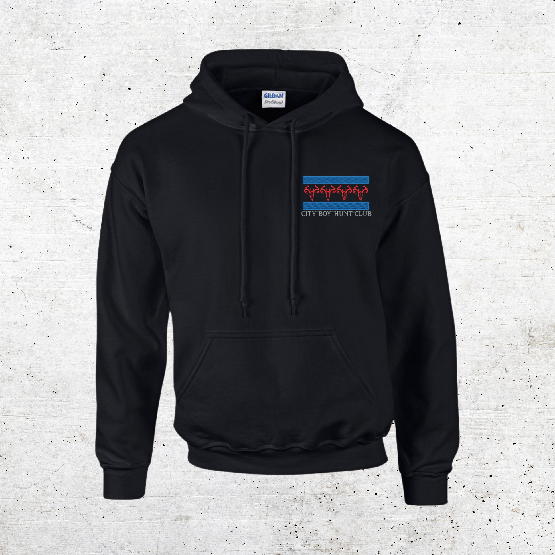 Choose from 6 different colors and sizes ranging from Small to 3XL to show off your elegant embroidered logo detailing on The City Boy Hunt Club pullover Hoodies.