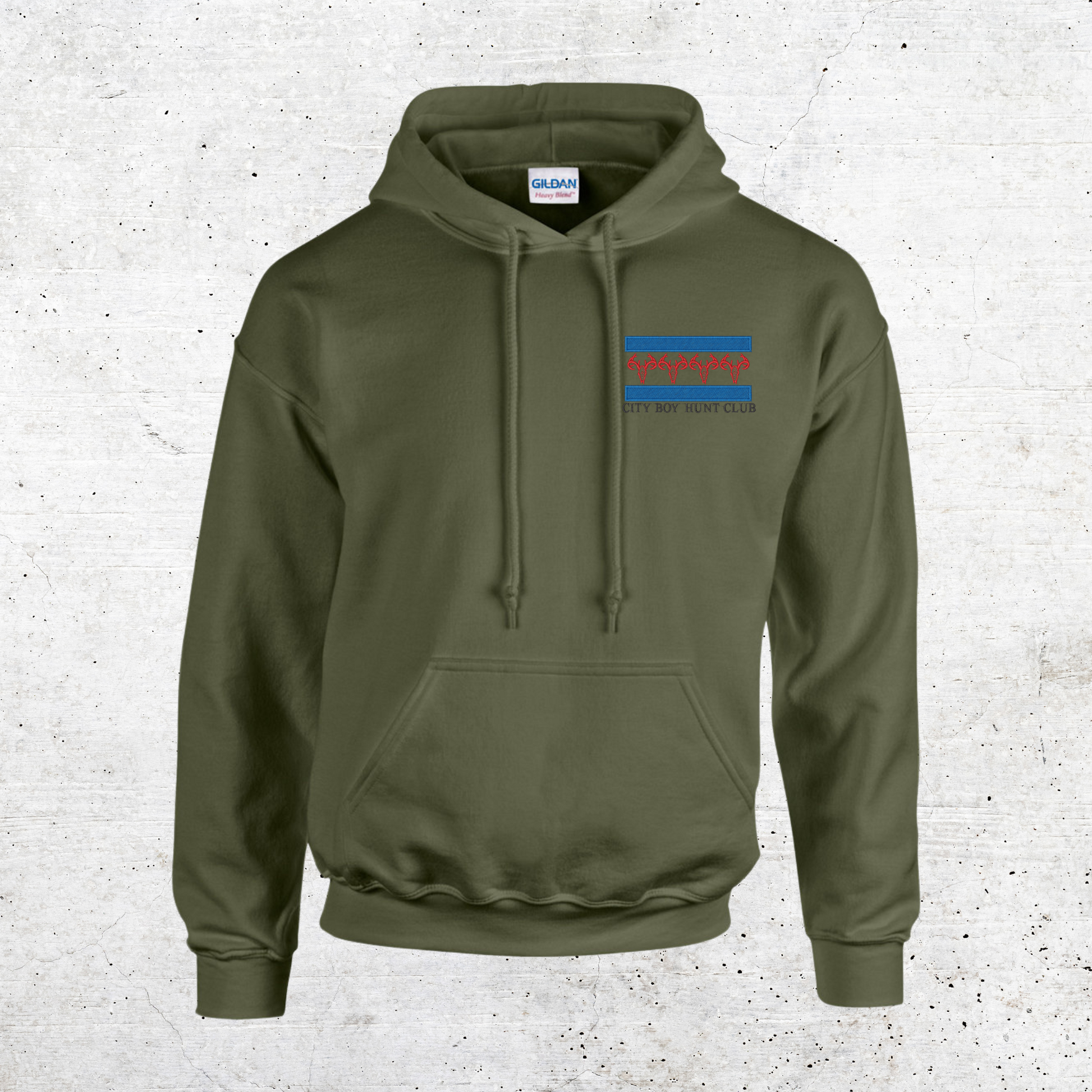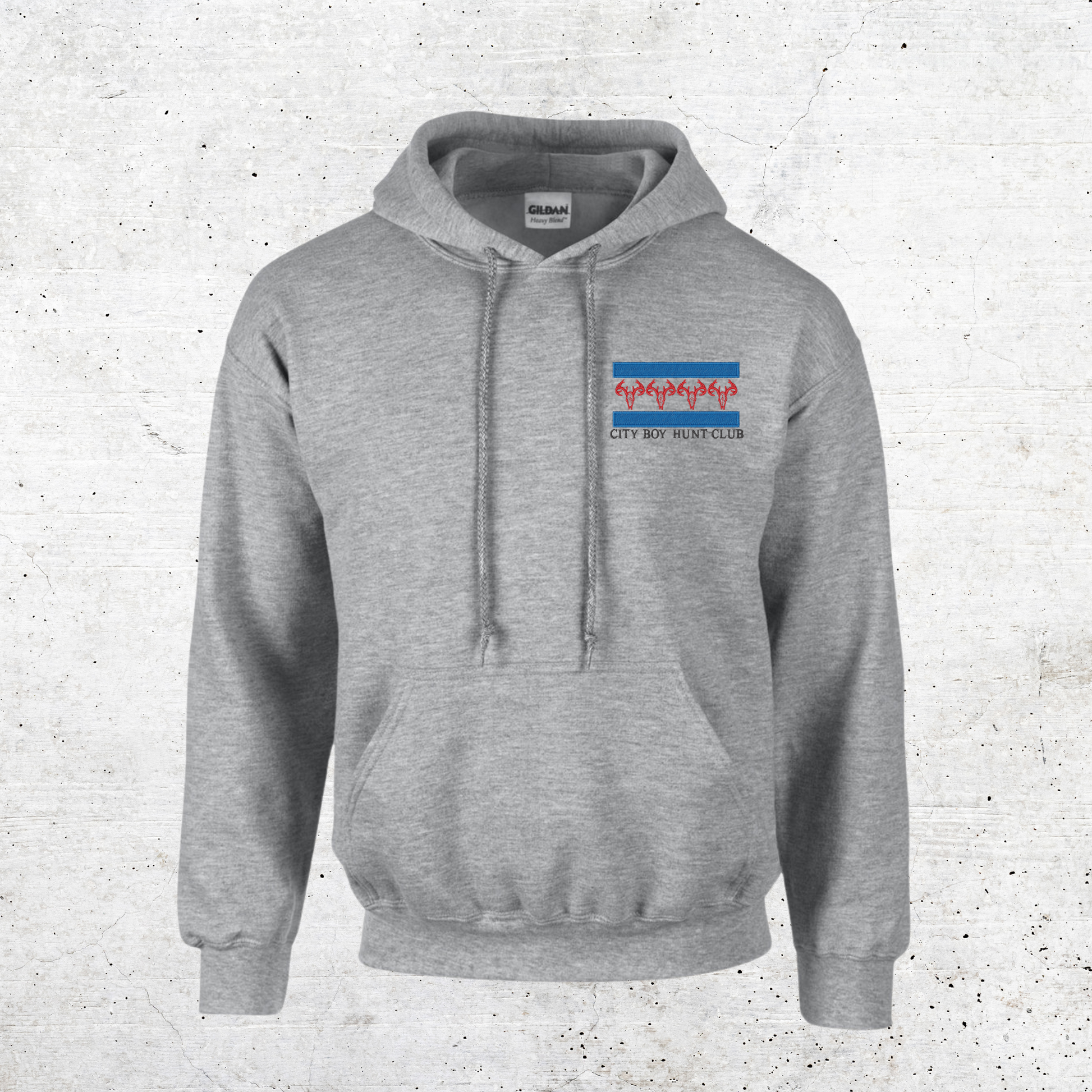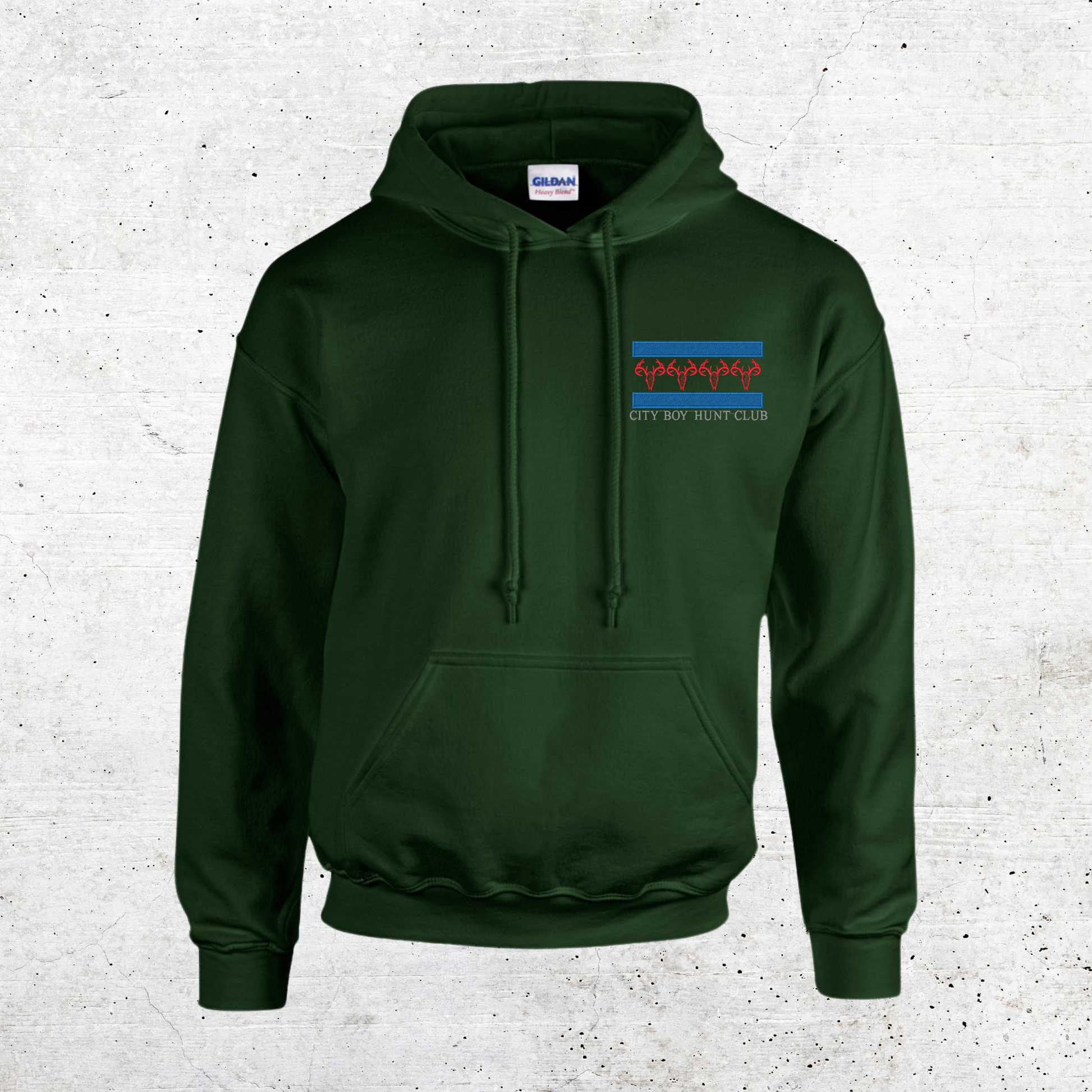 Choose from 6 different colors and sizes ranging from Small to 3XL to show off your elegant embroidered logo detailing on The City Boy Hunt Club pullover Hoodies.