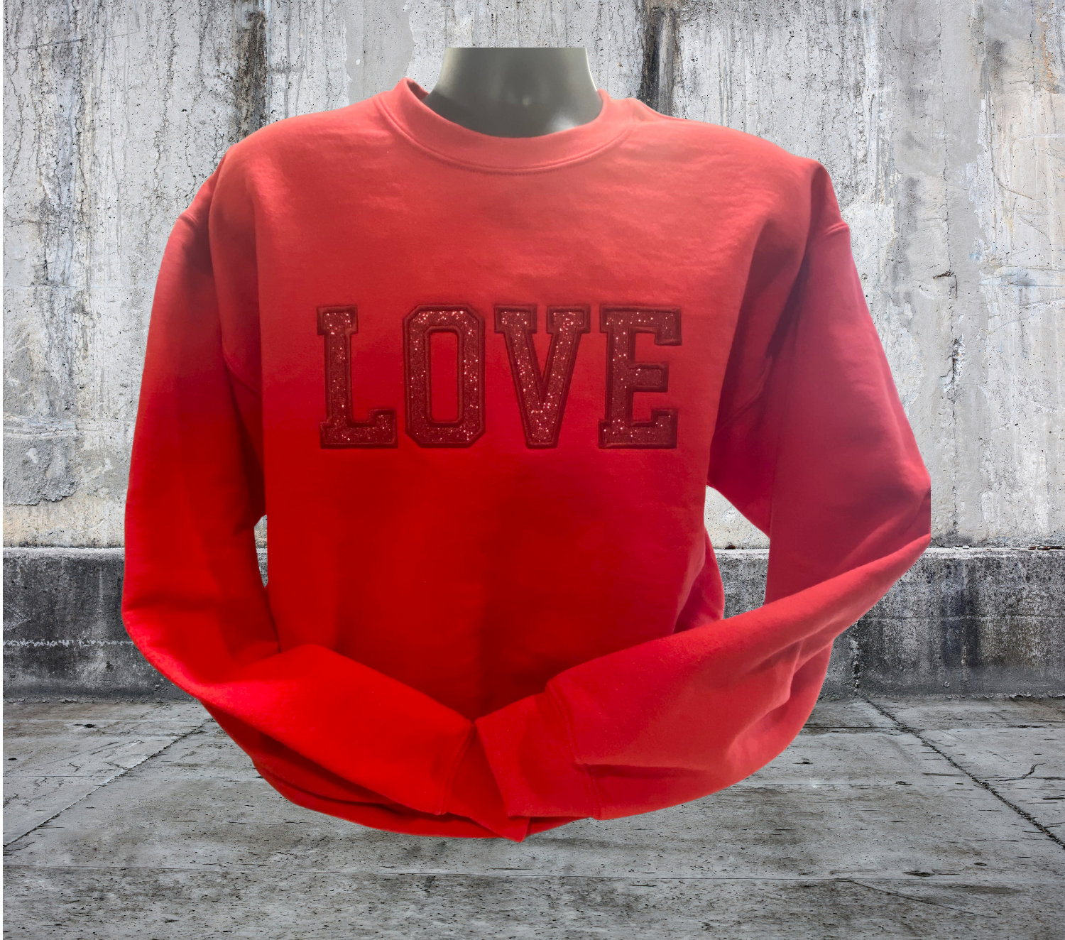 This LOVE crewneck sweater features embroidery and glitter vinyl, adding a touch of sparkle to your outfit. It's the ideal choice for Valentine's Day or any day of the year. If you prefer a different color, simply send an email and we can accommodate your request.