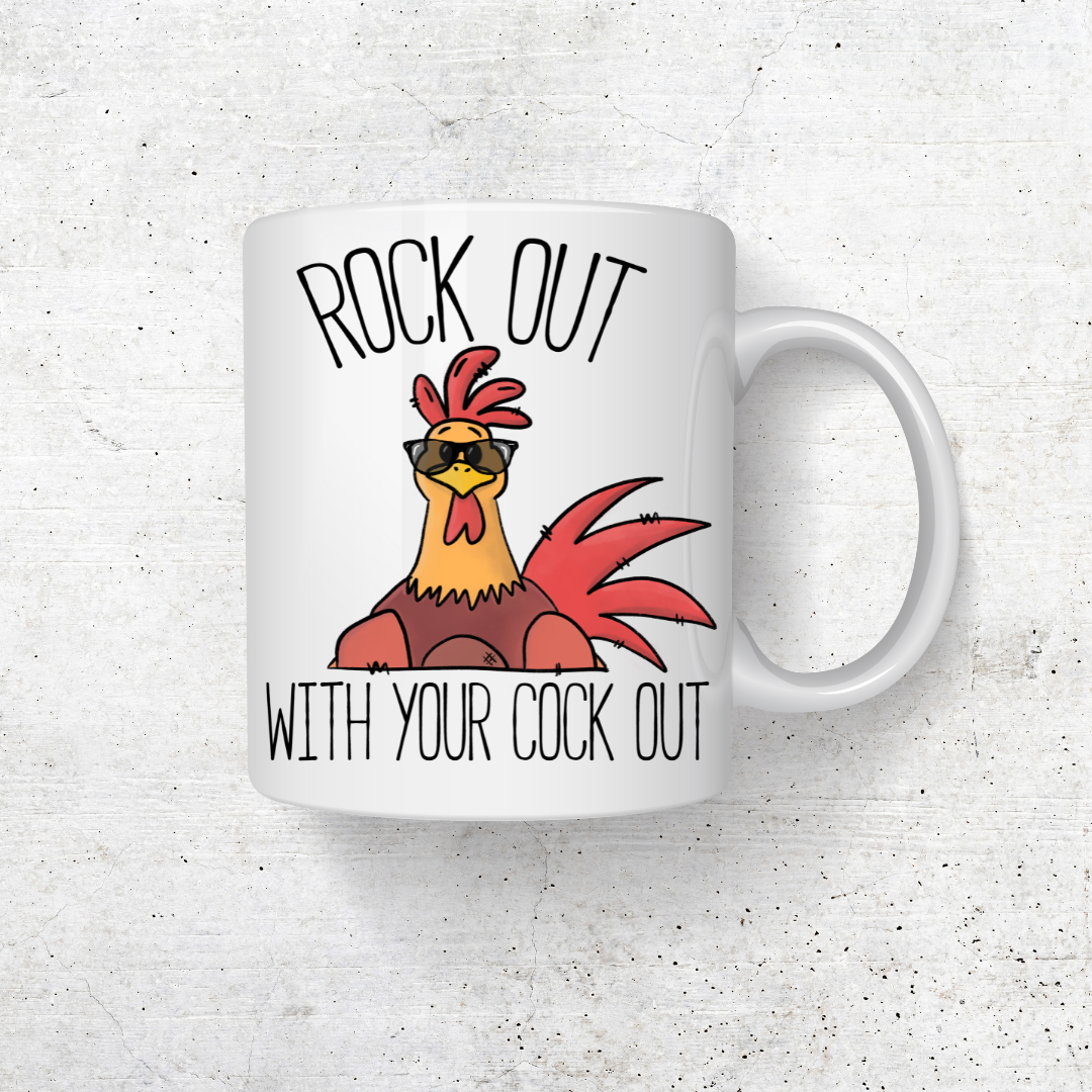 Two sizes are available for the ROCK OUT WITH YOUR COCK OUT COFFEE MUG. These ceramic mugs are safe to use in the dishwasher and microwave, and their designs are created using the sublimation process. No stickers are used, ensuring that the designs will not fade or wash away. Image will be on both sides of the cup.