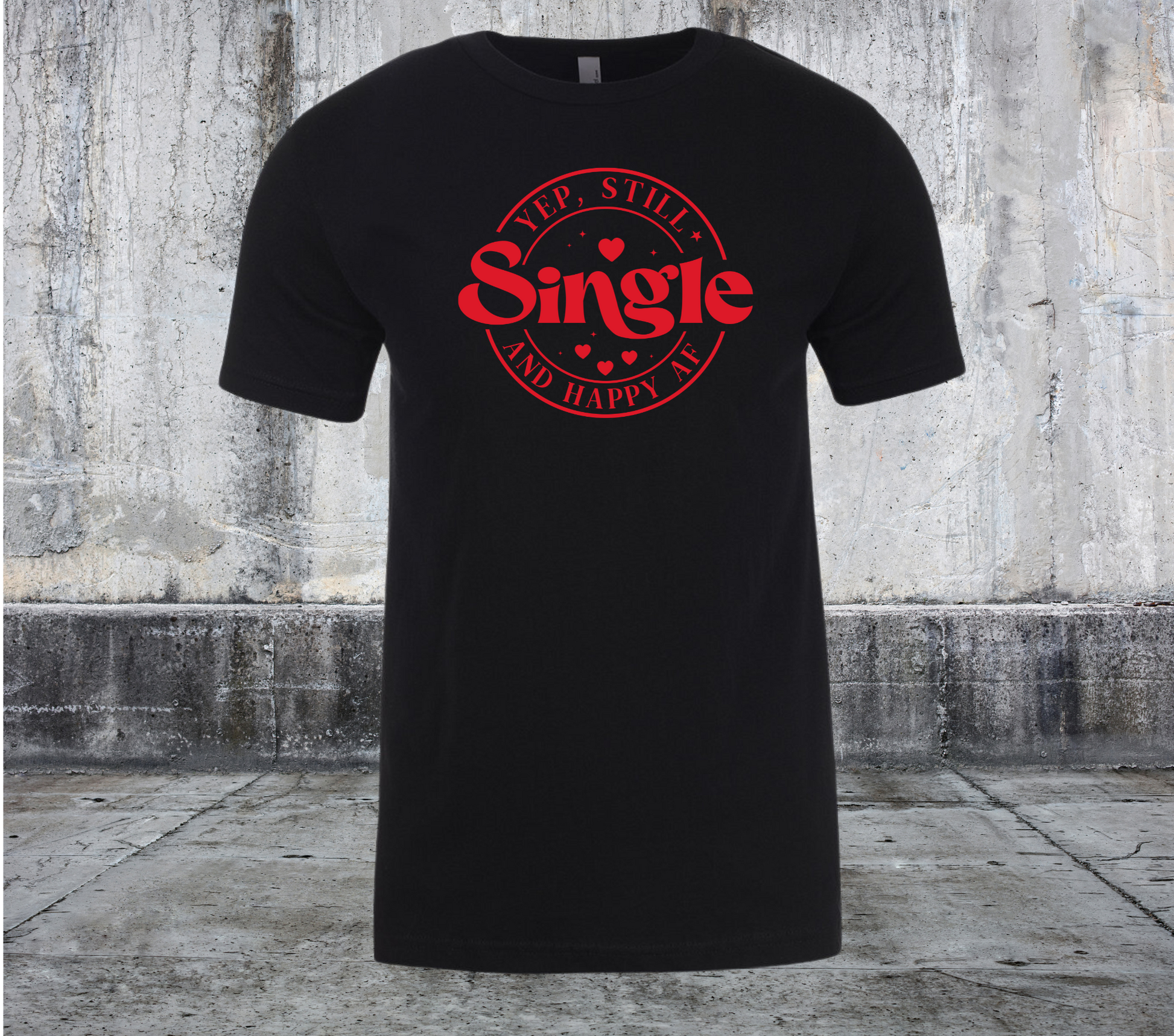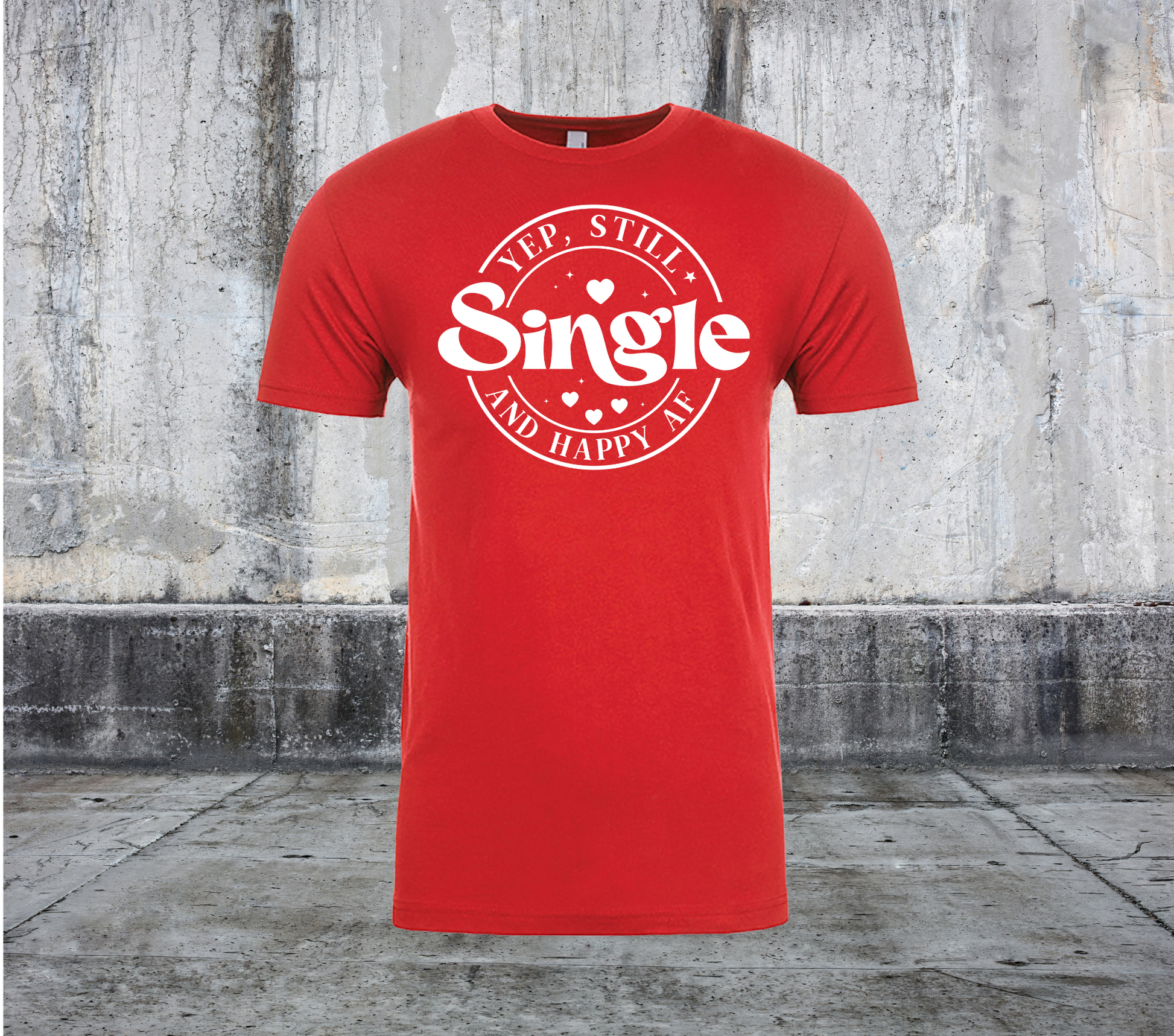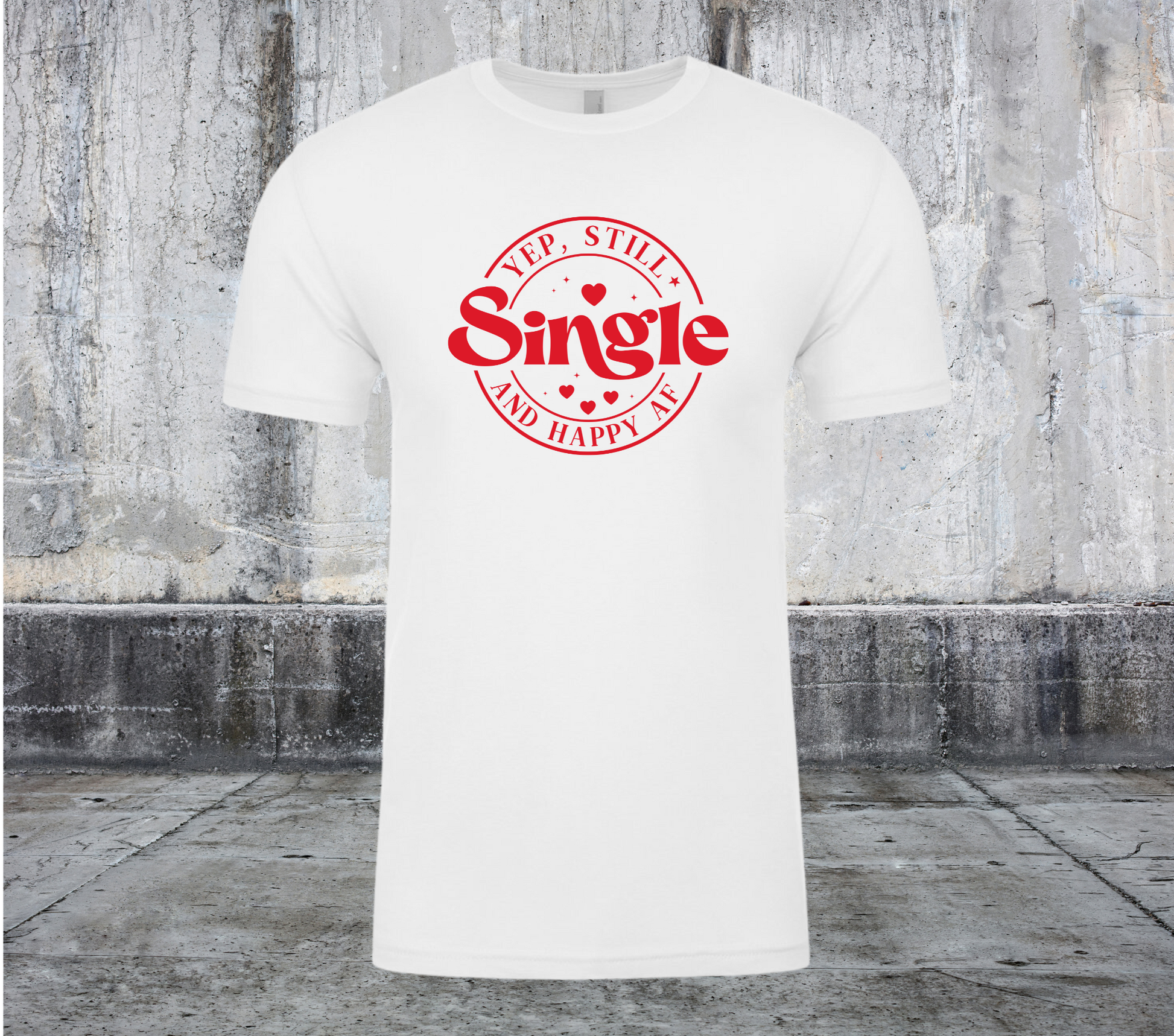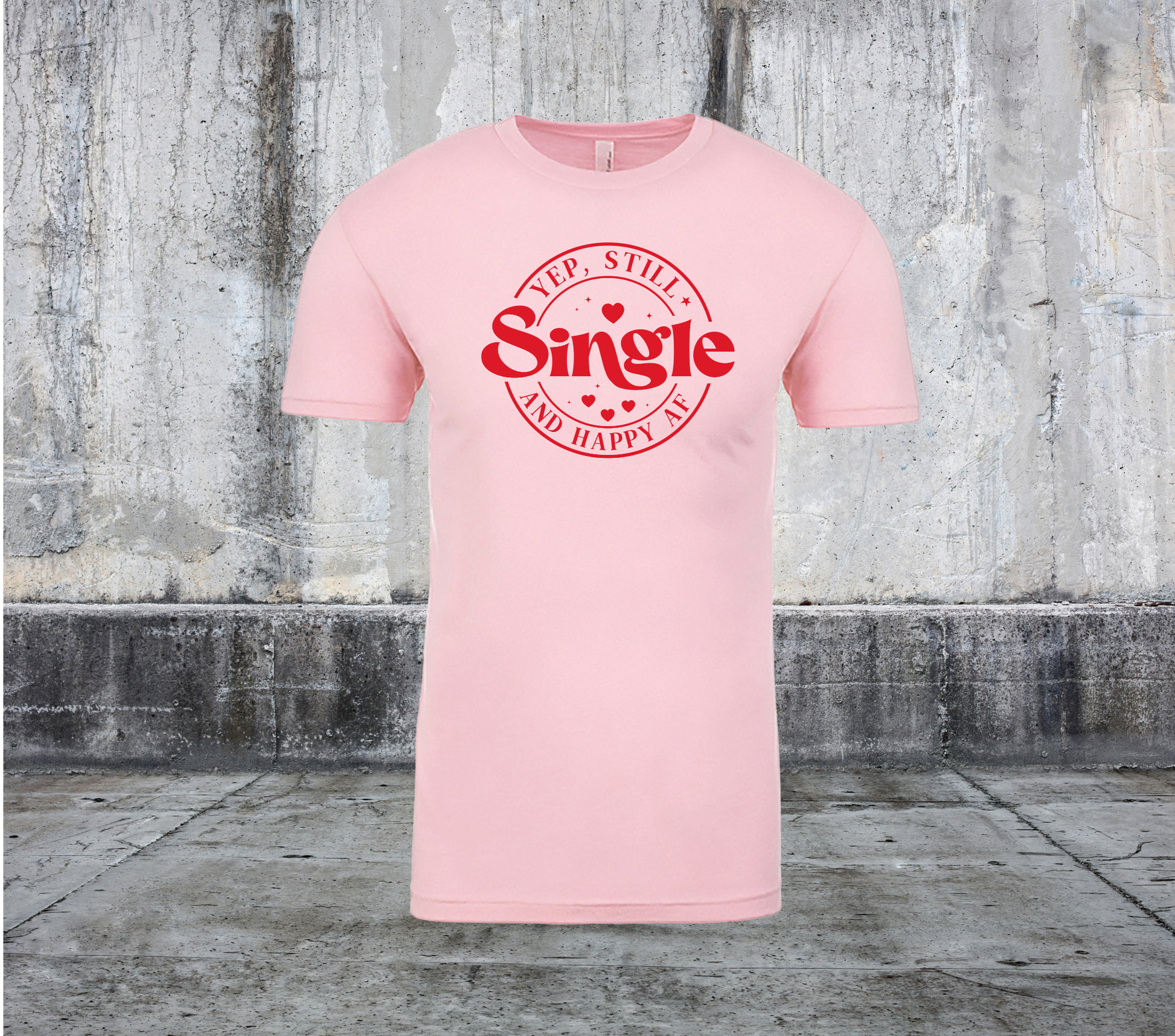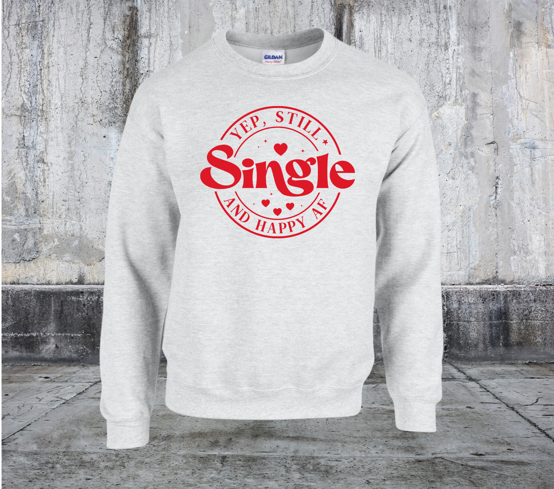 YEP STILL SINGLE AND HAPPY AF is available in a crewneck sweater or a t-shirt, perfect for letting others know your relationship status this Valentine's Day. Only Dusty Pink is available in t-shirts.